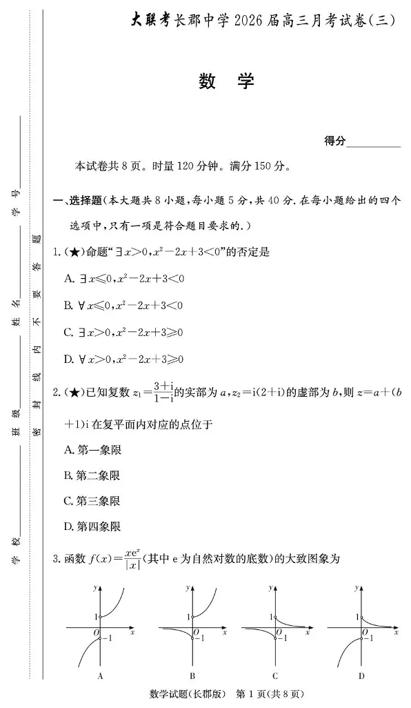 长郡中学2026届高三月考试卷(三)数学.pdf