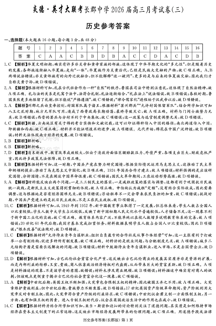 长郡中学2026届高三月考试卷(三)历史答案.pdf
