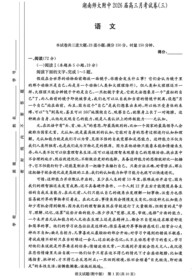 湖南师大附中2026届高三月考试卷(三)语文.pdf