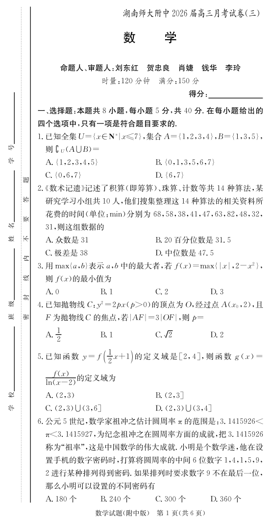 湖南师大附中2026届高三月考试卷(三)数学.pdf