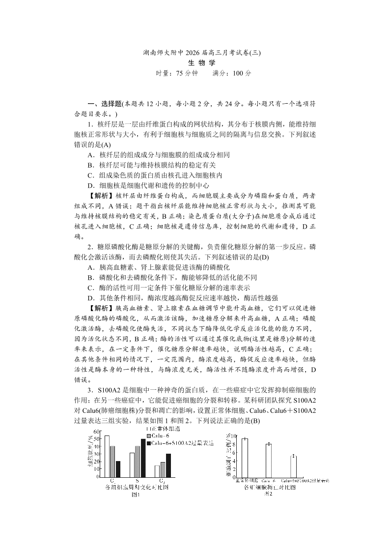 湖南师大附中2026届高三月考试卷(三)生物答案.pdf