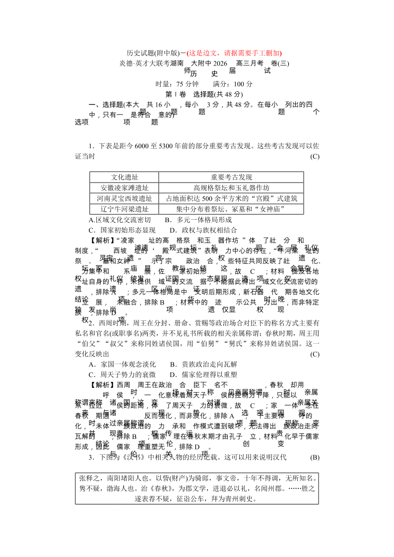 湖南师大附中2026届高三月考试卷(三)历史答案.pdf