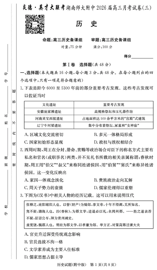 湖南师大附中2026届高三月考试卷(三)历史.pdf