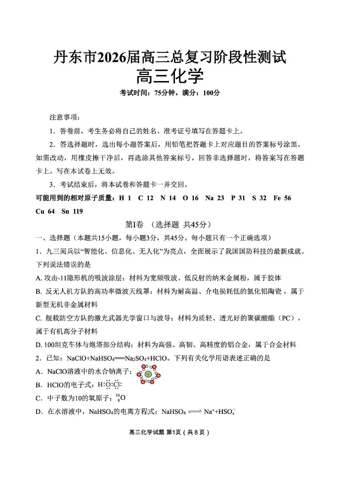 丹东市2026届高三总复习阶段测试化学.pdf