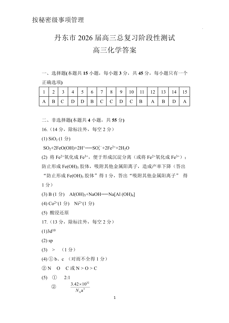 丹东市2026届高三总复习阶段测试化学答案.pdf