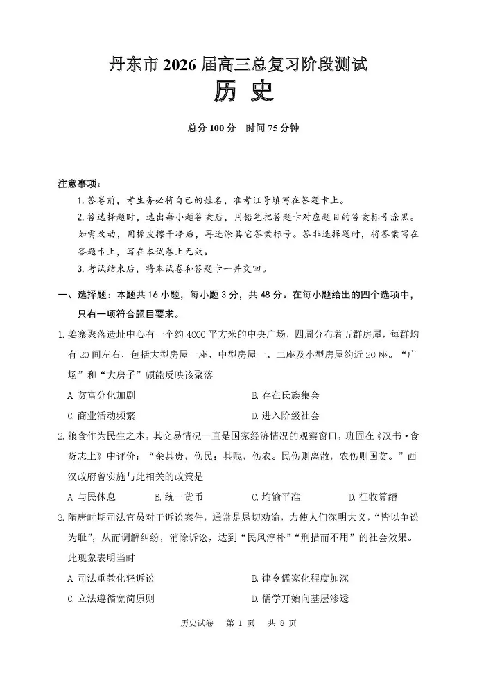 丹东市2026届高三总复习阶段测试历史.pdf