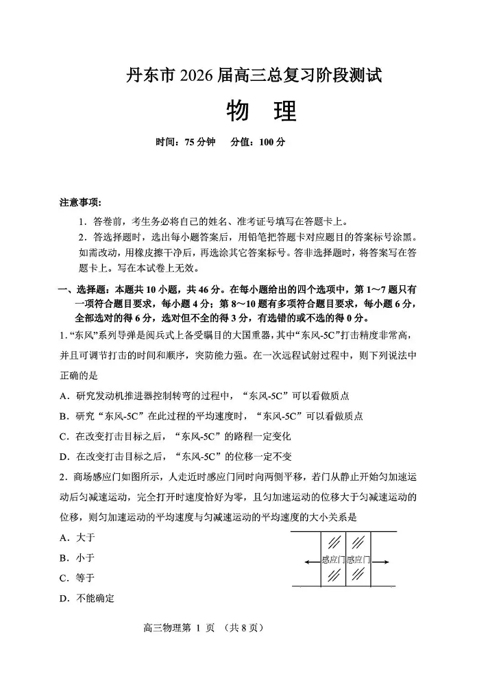 丹东市2026届高三总复习阶段测试物理.pdf