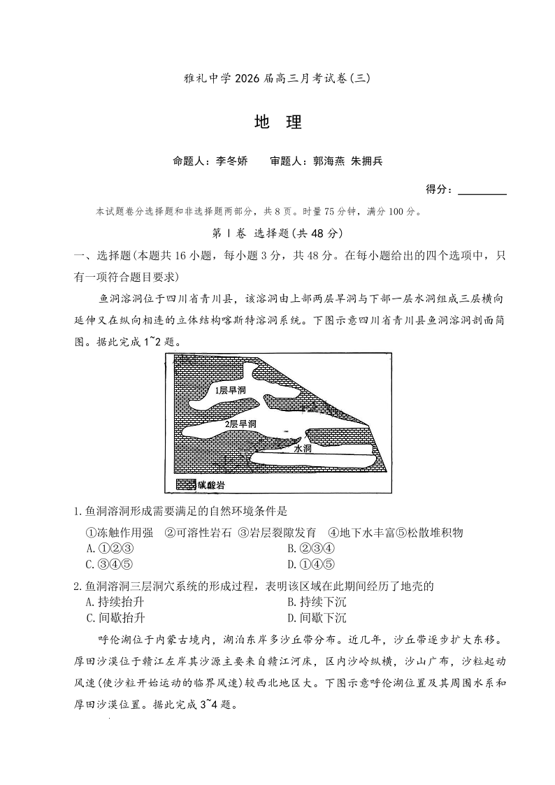 雅礼中学2026届高三月考试卷(三)地理.pdf