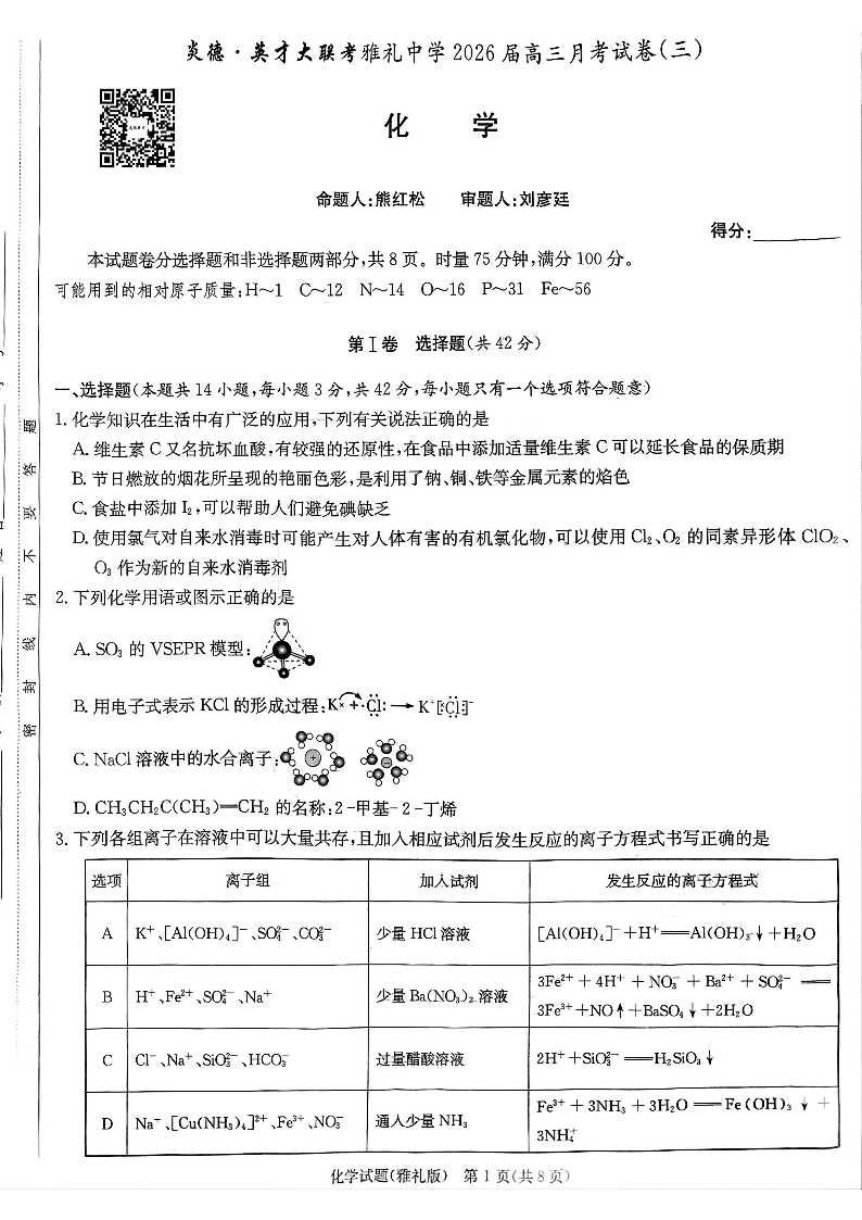 雅礼中学2026届高三月考试卷(三)化学.pdf