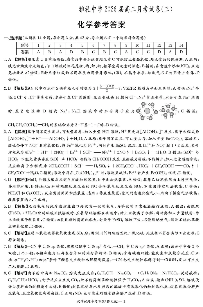 雅礼中学2026届高三月考试卷(三)化学答案.pdf