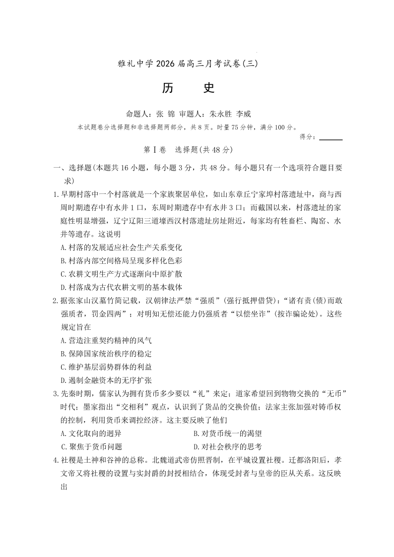 雅礼中学2026届高三月考试卷(三)历史.pdf