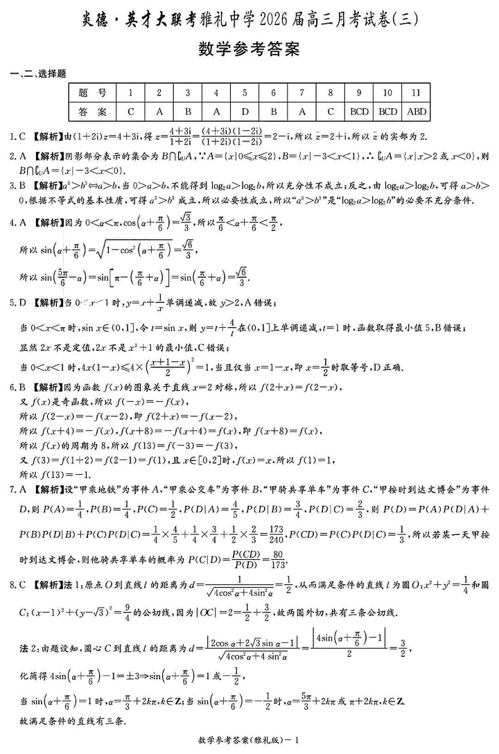 雅礼中学2026届高三月考试卷(三)数学答案.pdf