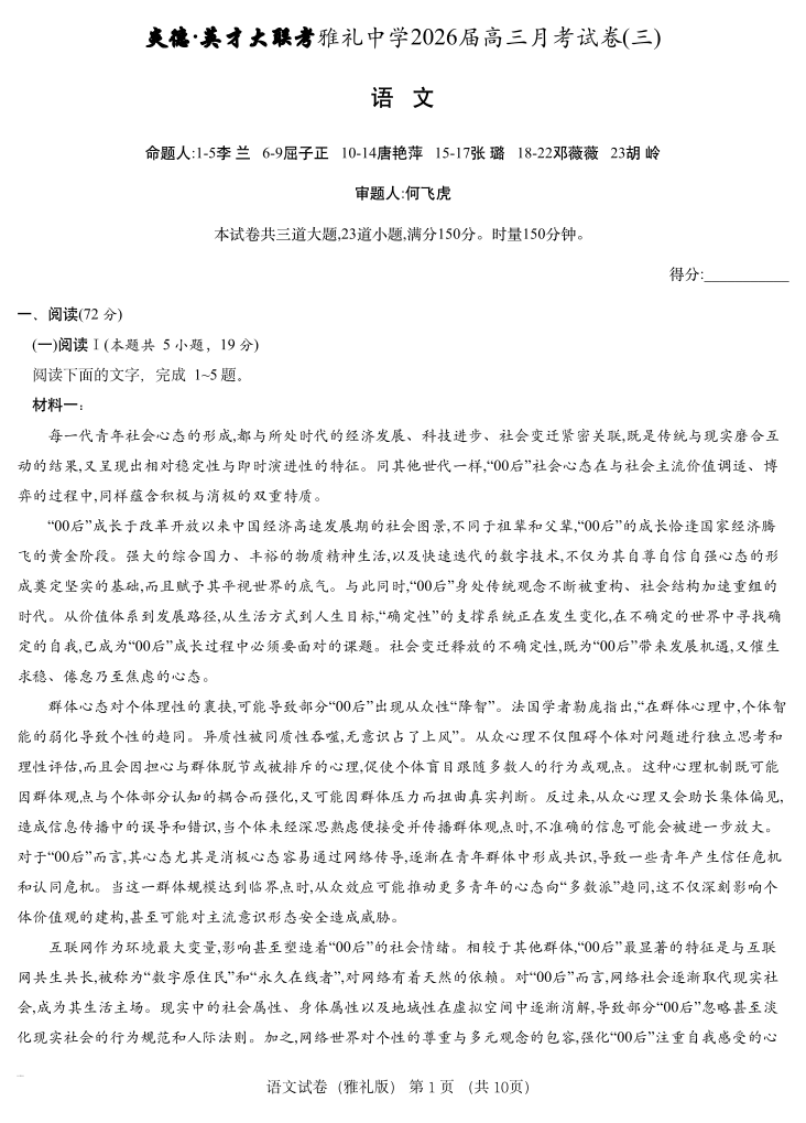雅礼中学2026届高三月考试卷(三)语文.pdf