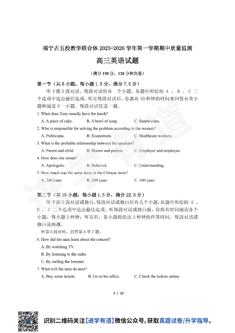 福宁古五校教学联合体2025-2026学年第一学期高三期中质量监测 英语.pdf