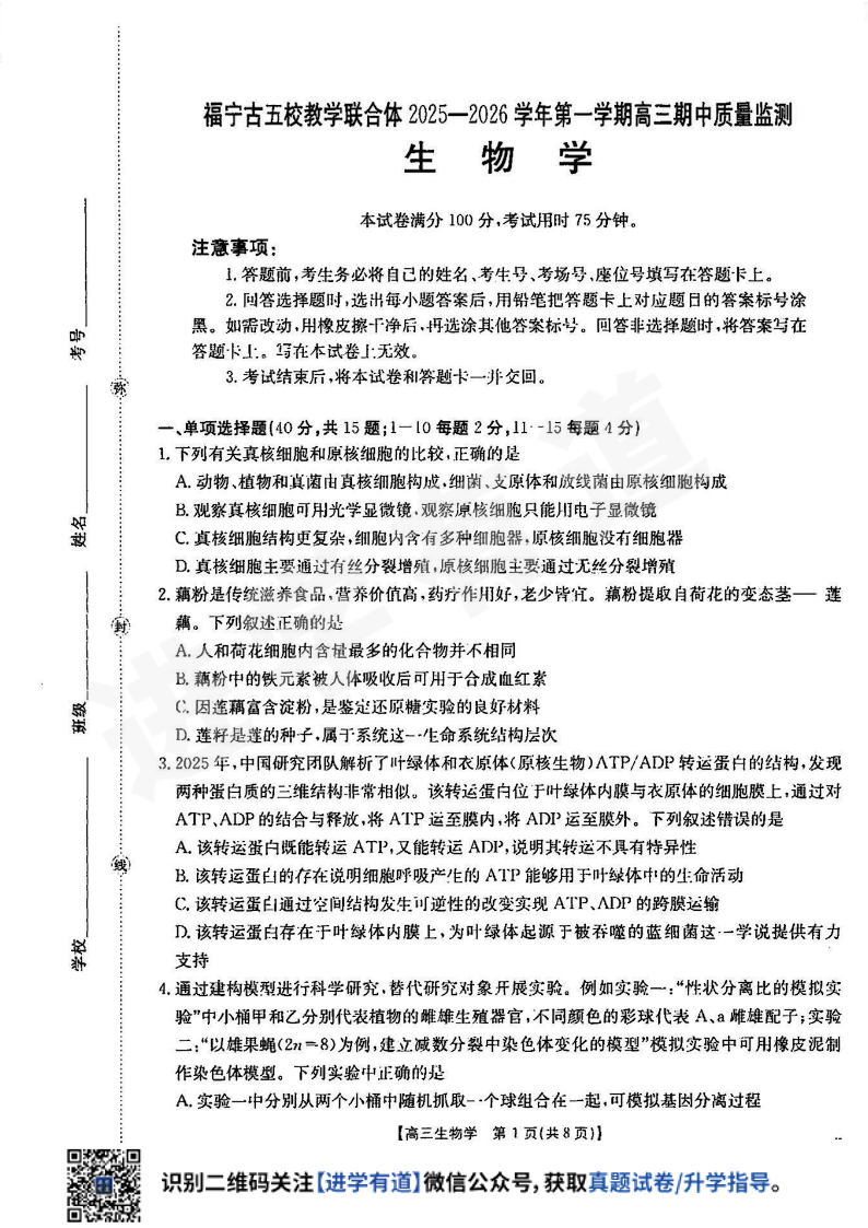 福宁古五校教学联合体2025-2026学年第一学期高三期中质量监测 生物.pdf