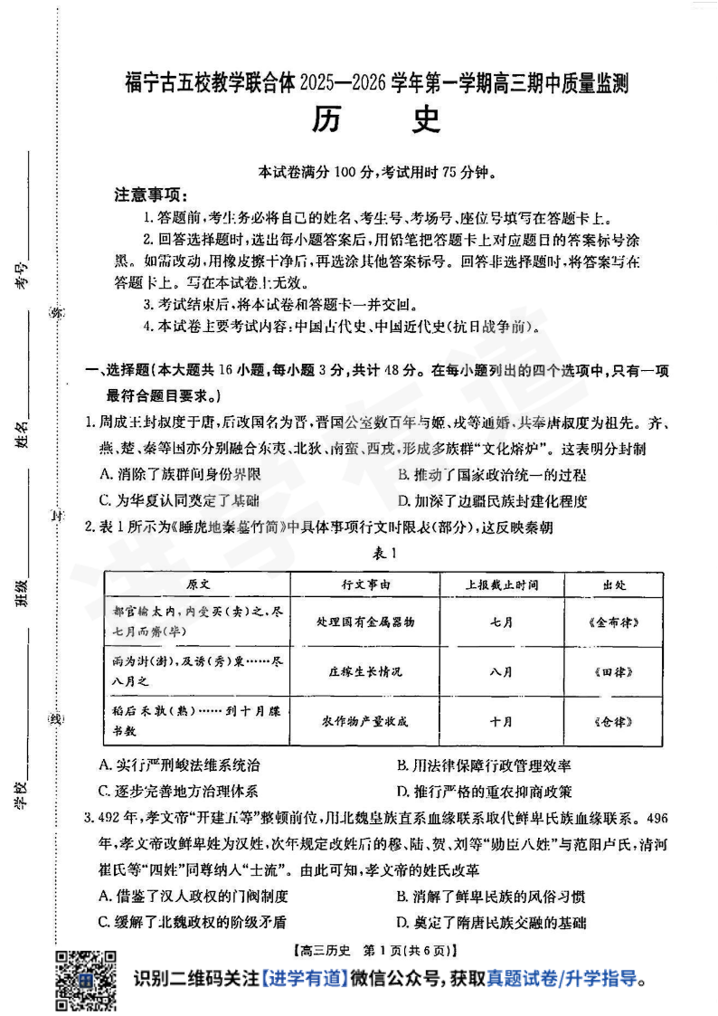福宁古五校教学联合体2025-2026学年第一学期高三期中质量监测 历史.pdf