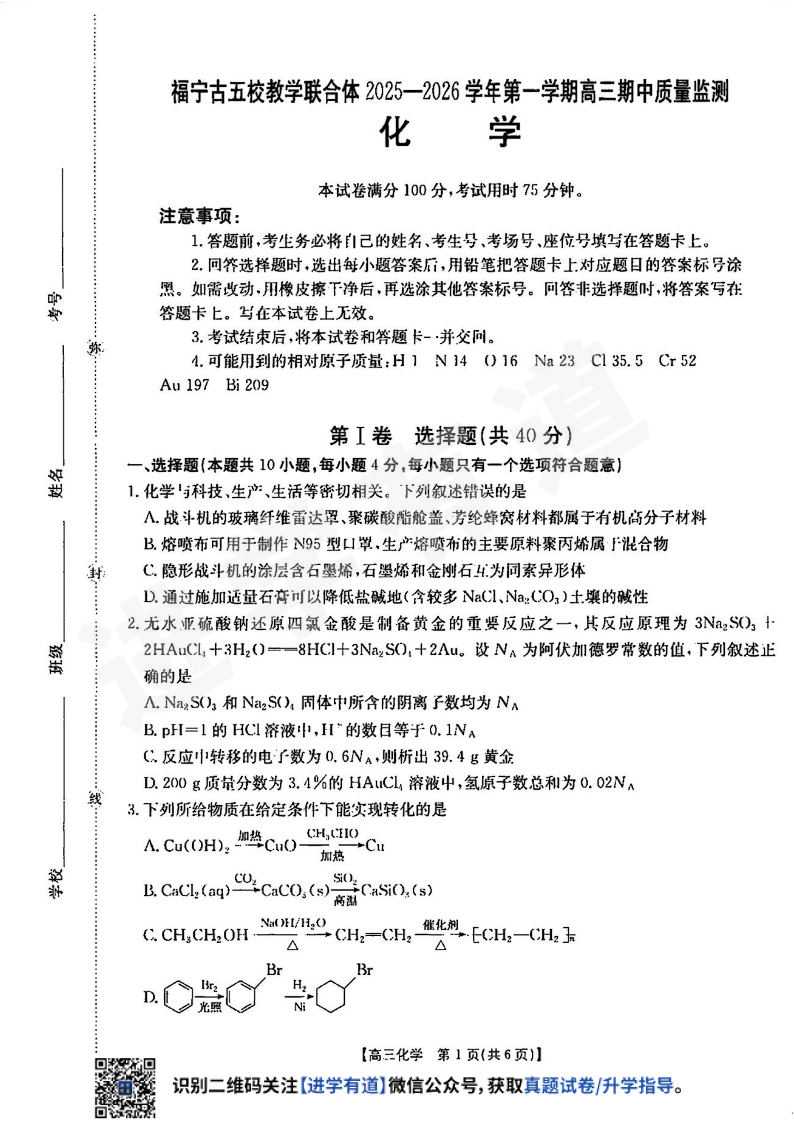 福宁古五校教学联合体2025-2026学年第一学期高三期中质量监测 化学.pdf