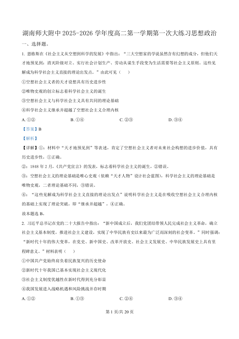 2025~2026学年湖南师大附中高二年级第1次月考 政治答案.docx