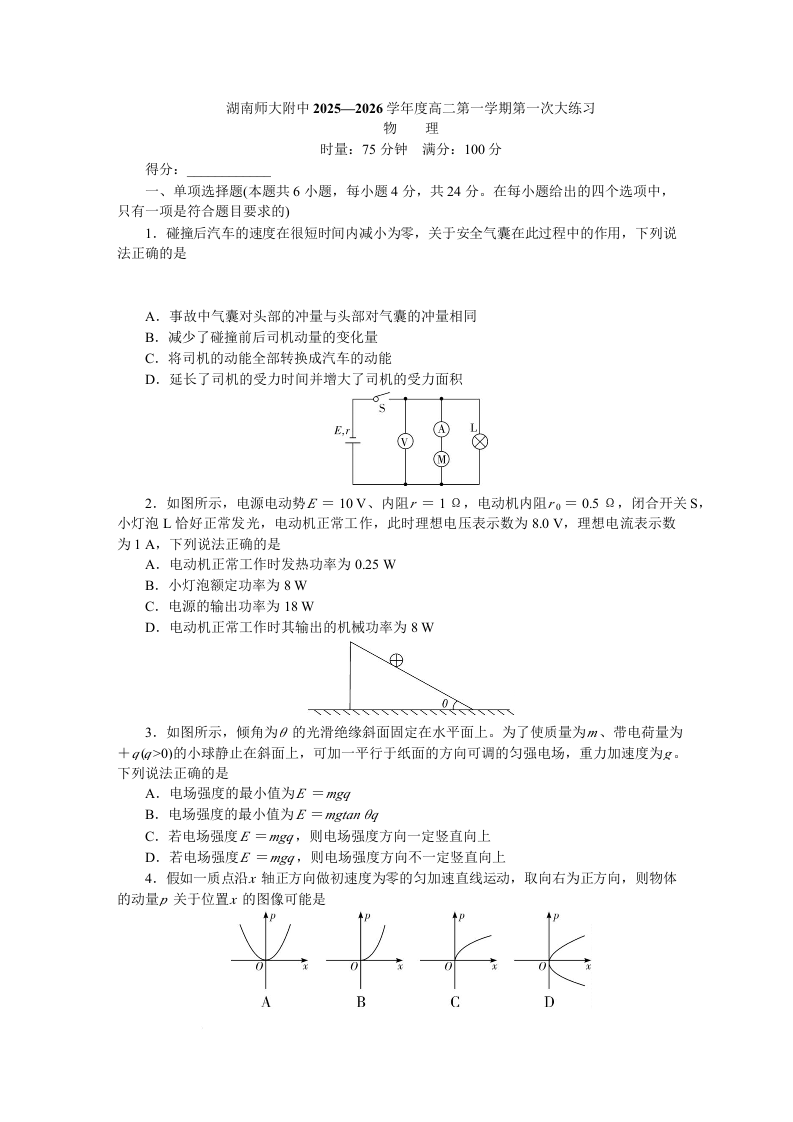 2025~2026学年湖南师大附中高二年级第1次月考 物理.docx