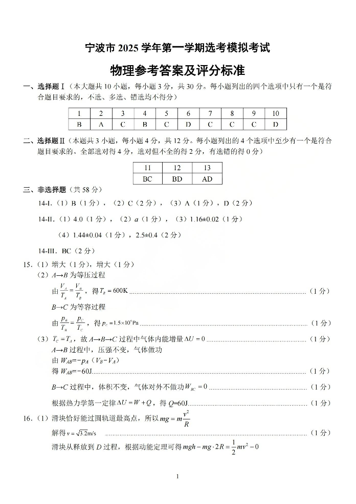 宁波市2025学年第一学期高考模拟考试 物理答案.pdf