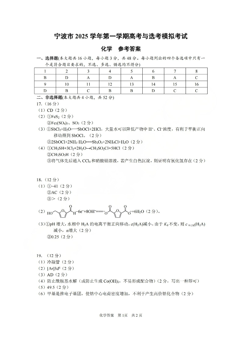 宁波市2025学年第一学期高考模拟考试 化学答案.pdf