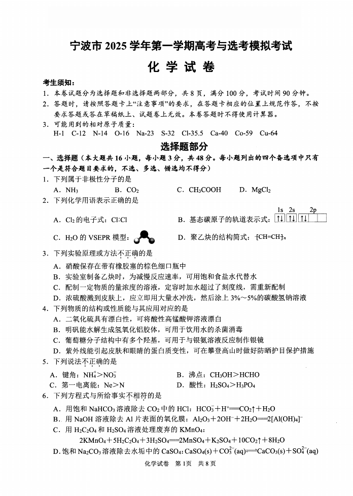 宁波市2025学年第一学期高考模拟考试 化学.pdf