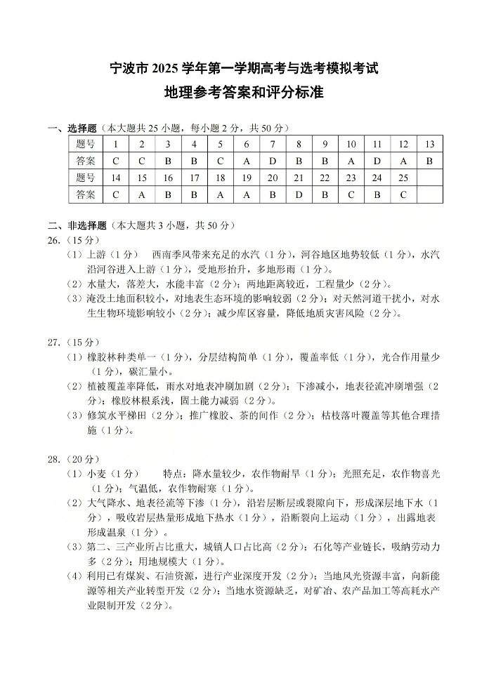 宁波市2025学年第一学期高考模拟考试 地理答案.pdf