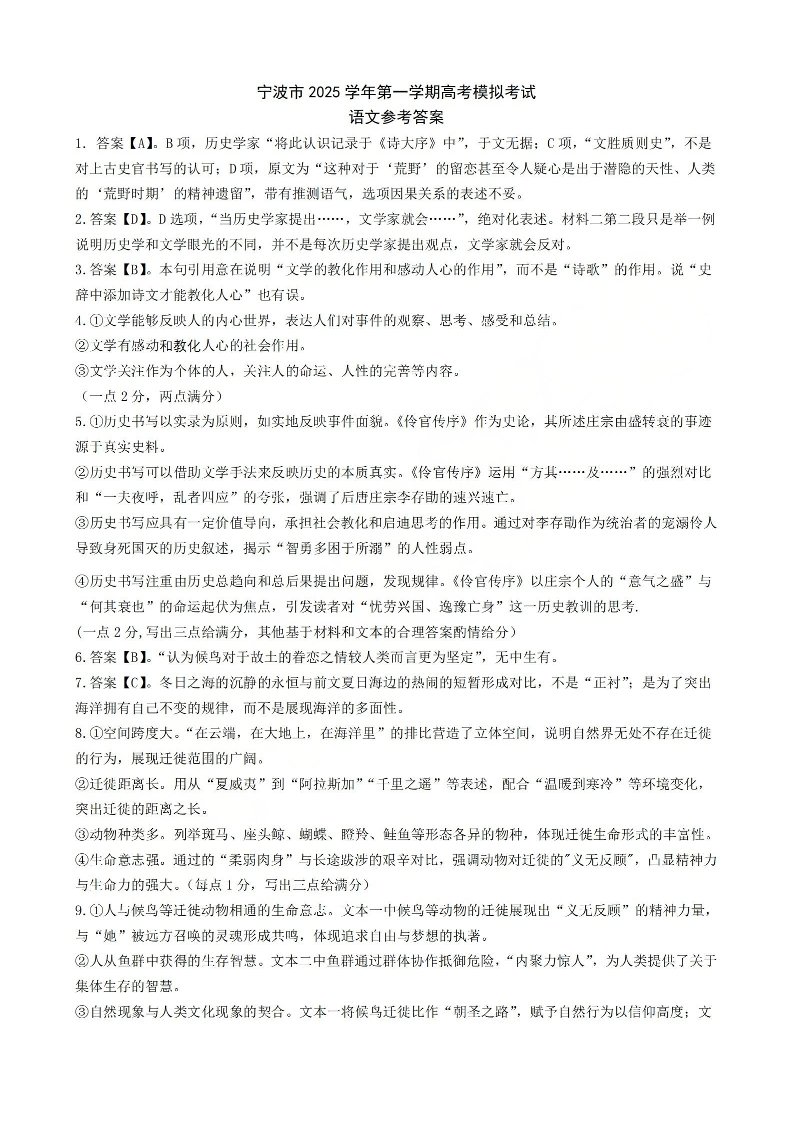 宁波市2025学年第一学期高考模拟考试 语文答案.pdf