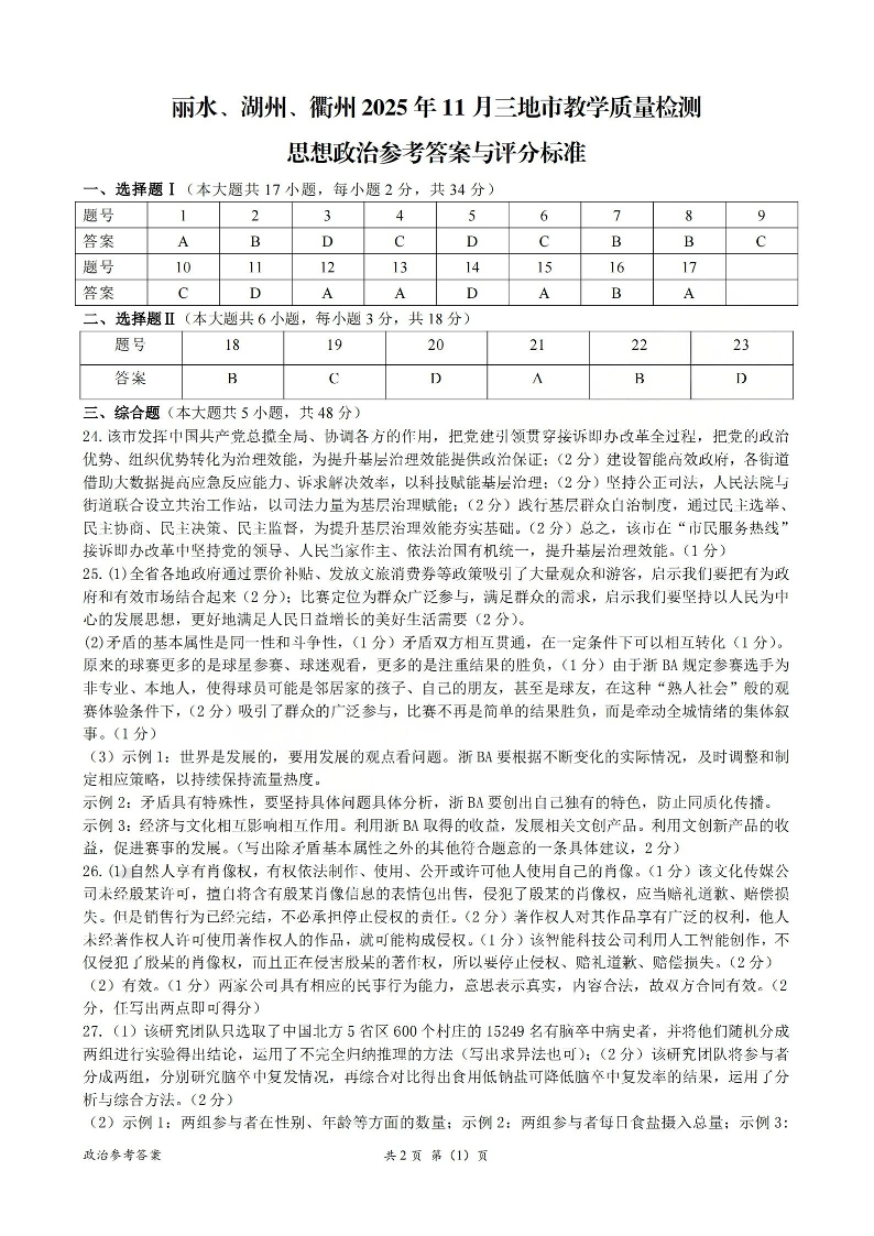 丽水、湖州、衢州2025年11月三地市高三教学质量检测 政治答案.pdf