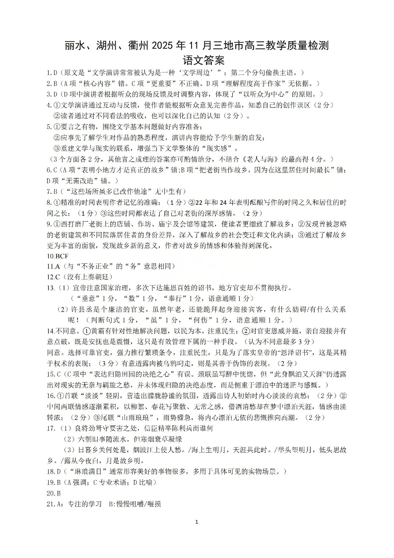 丽水、湖州、衢州2025年11月三地市高三教学质量检测 语文答案.pdf