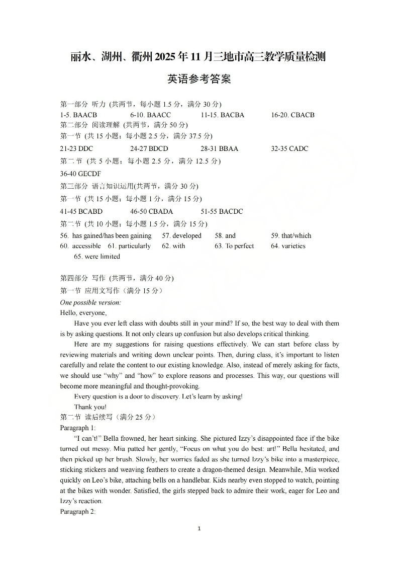 丽水、湖州、衢州2025年11月三地市高三教学质量检测 英语答案.pdf