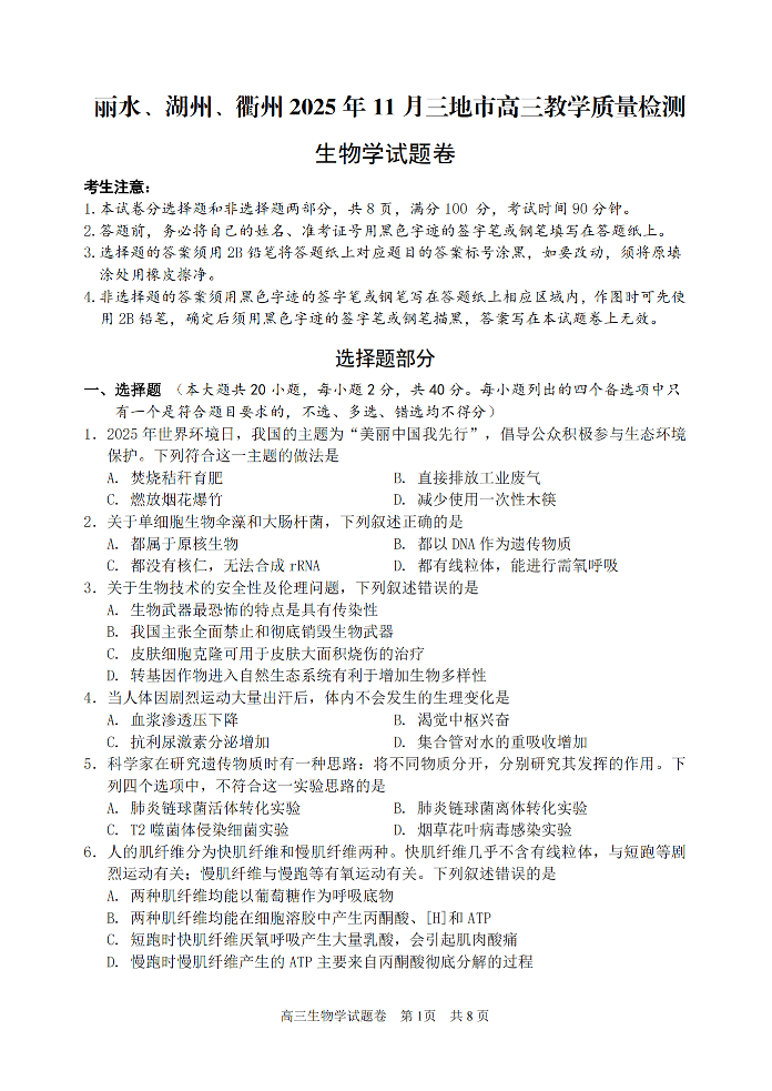 丽水、湖州、衢州2025年11月三地市高三教学质量检测 生物.pdf