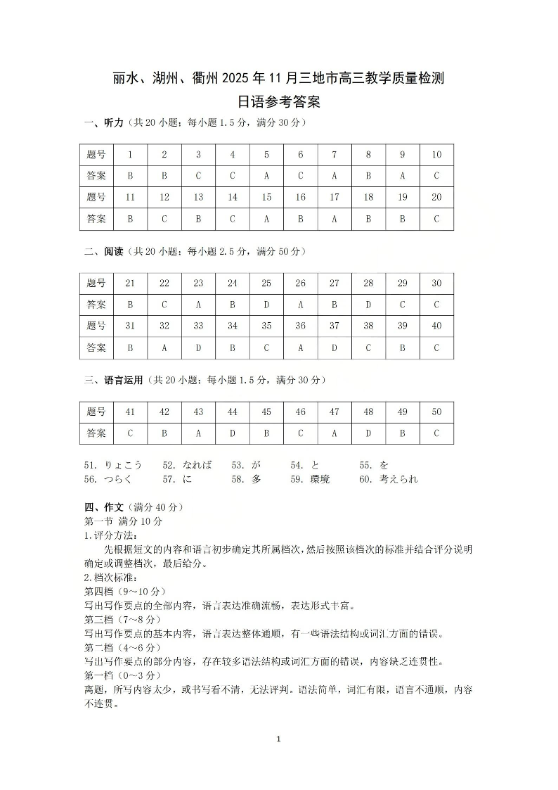 丽水、湖州、衢州2025年11月三地市高三教学质量检测 日语答案.pdf