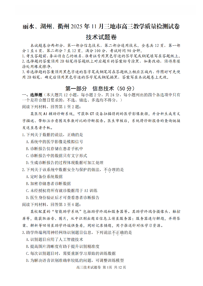 丽水、湖州、衢州2025年11月三地市高三教学质量检测 技术.pdf