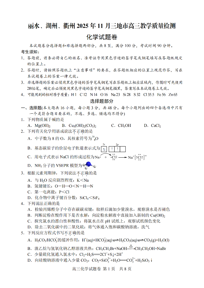 丽水、湖州、衢州2025年11月三地市高三教学质量检测 化学.pdf