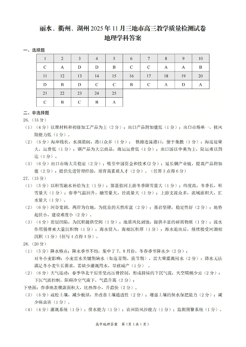 丽水、湖州、衢州2025年11月三地市高三教学质量检测 地理答案.pdf