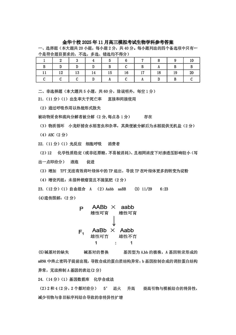金华十校2025年11月高三模拟考试 生物答案.pdf