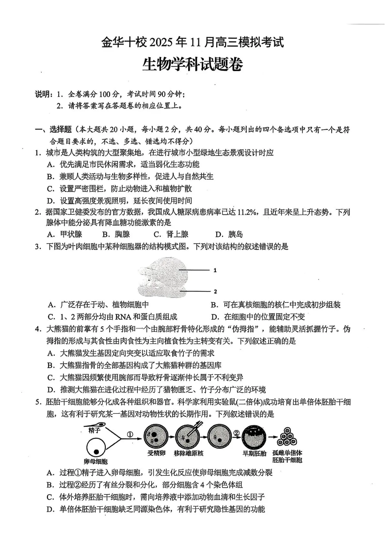 金华十校2025年11月高三模拟考试 生物.pdf