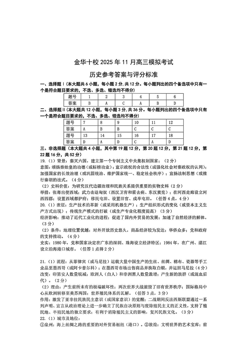 金华十校2025年11月高三模拟考试 历史答案.pdf