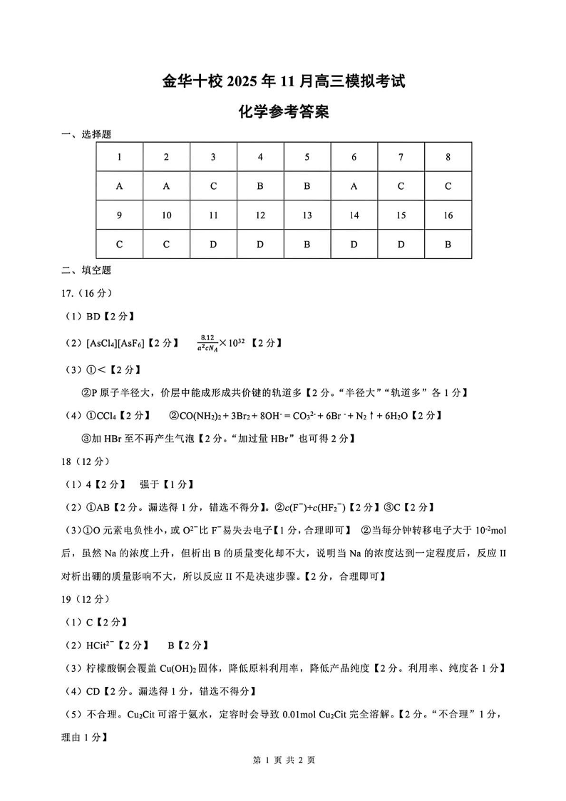 金华十校2025年11月高三模拟考试 化学答案.pdf
