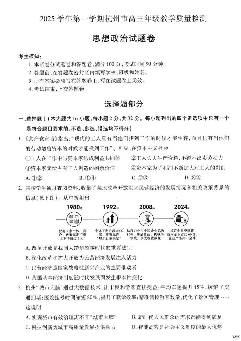 2025学年第一学期杭州市高三年级教学质量检测 政治.pdf