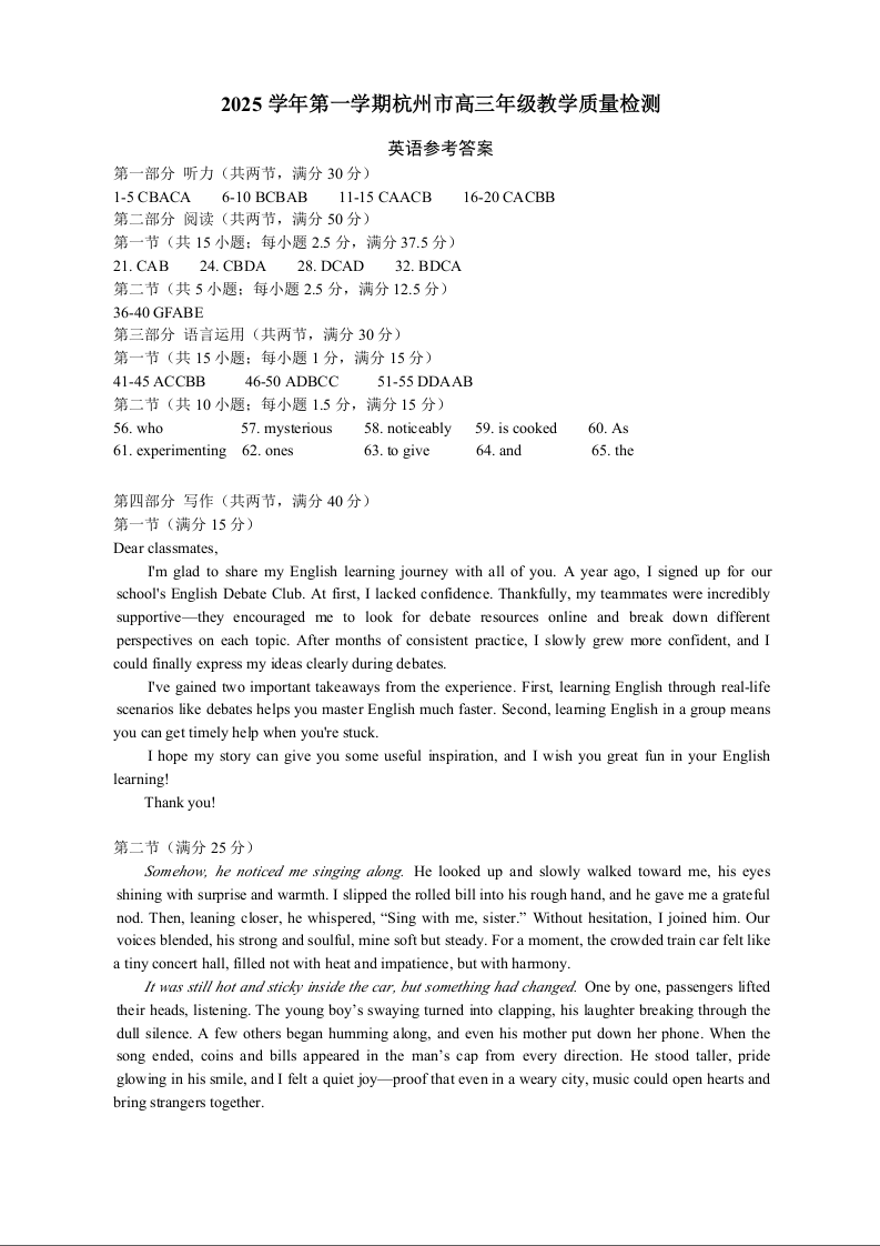 2025学年第一学期杭州市高三年级教学质量检测 英语答案.docx