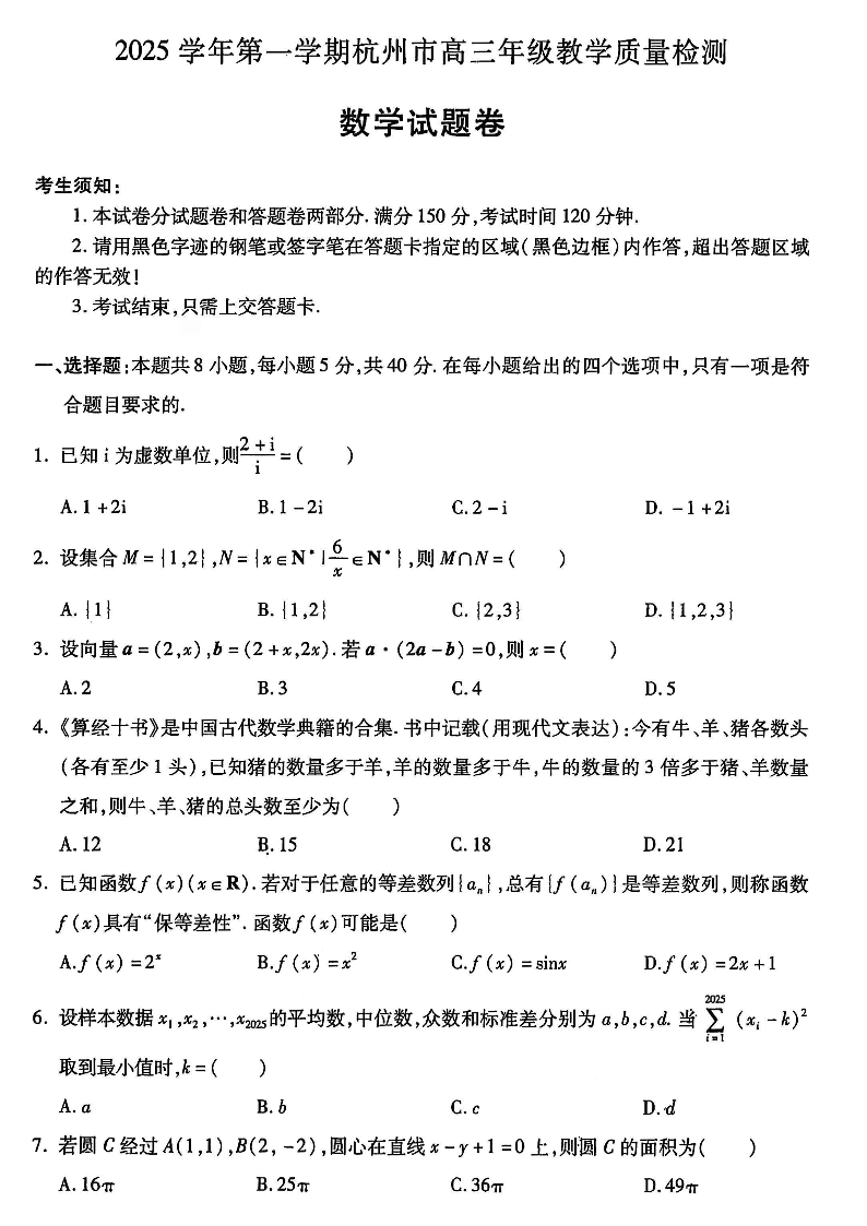 2025学年第一学期杭州市高三年级教学质量检测 数学.pdf