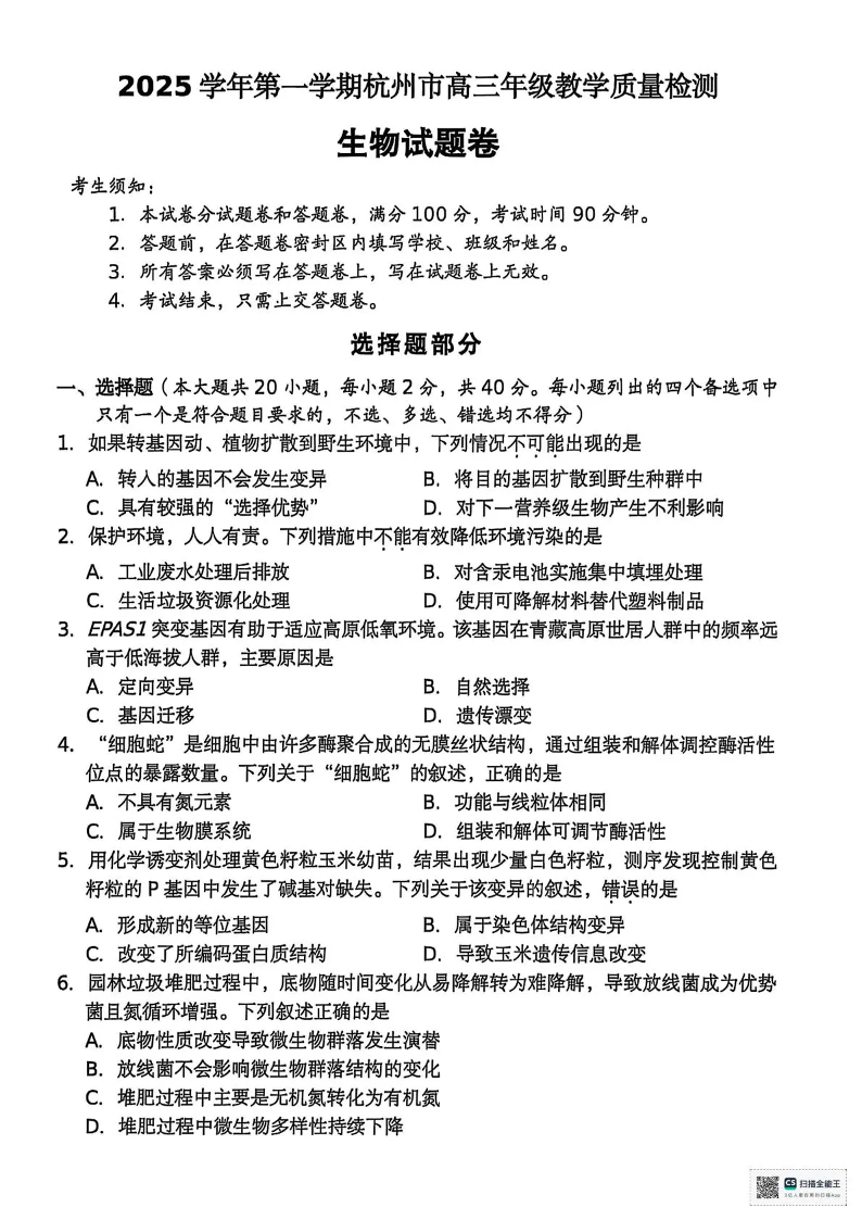 2025学年第一学期杭州市高三年级教学质量检测 生物.pdf