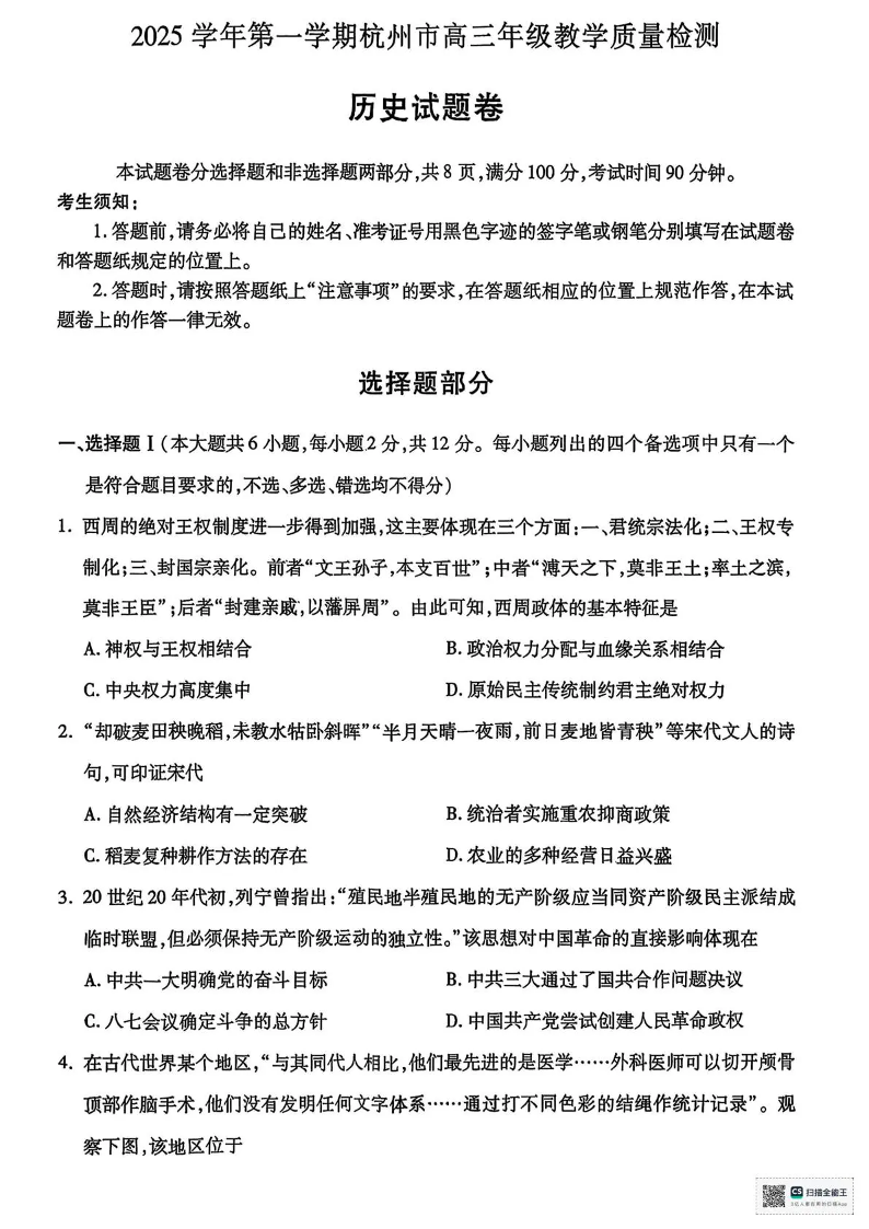 2025学年第一学期杭州市高三年级教学质量检测 历史.pdf