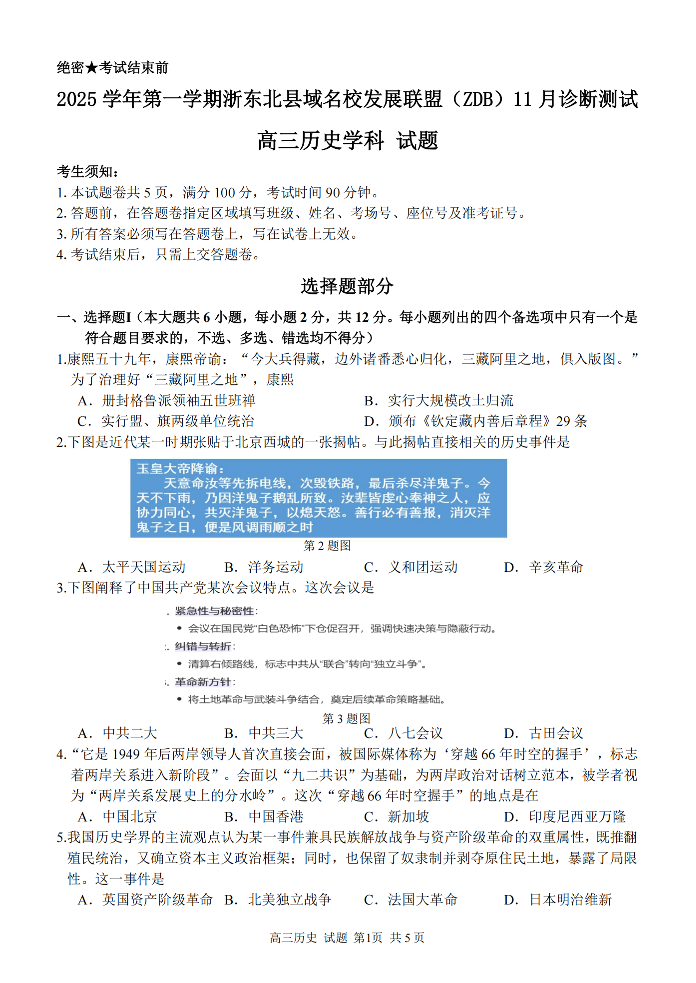 2025学年第一学期浙东北县域名校发展联盟(ZDB)11月诊断测试 历史.pdf