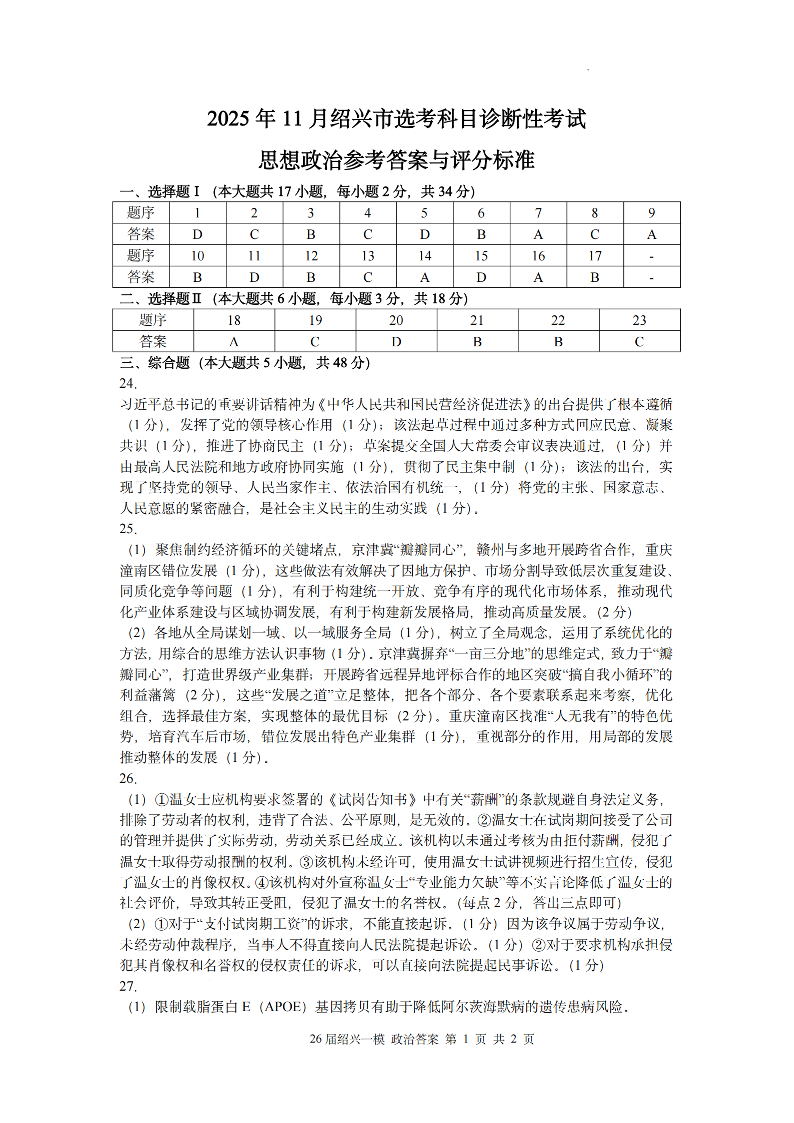 2025年11月绍兴市高考科目诊断性考试 政治答案.pdf