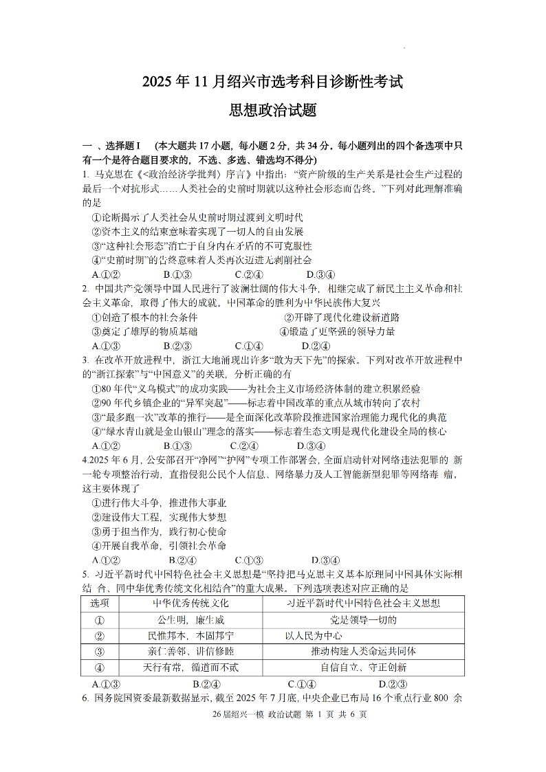 2025年11月绍兴市高考科目诊断性考试 政治.pdf