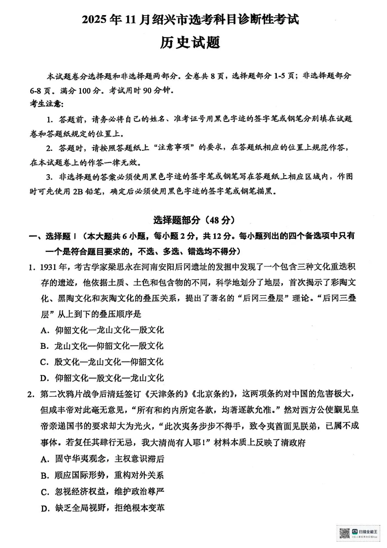 2025年11月绍兴市高考科目诊断性考试 历史.pdf