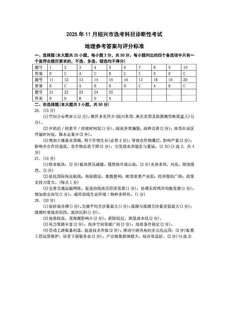 2025年11月绍兴市高考科目诊断性考试 地理答案.pdf